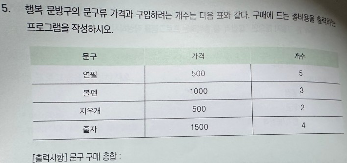 price = {'연필':[500, 5], '볼펜':[1000, 3], '지우개':[500,2], '줄자':[1500,4]} # 딕셔너리의 value를 리스트[가격, 수량] 으로 함