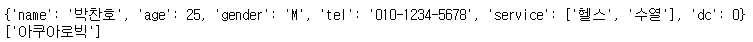 '2019-052001':{'name':'박찬호', 'age':25, 'gender':'M', 'tel':'010-1234-5678', 'service':['헬스','수열'], 'dc':0}
