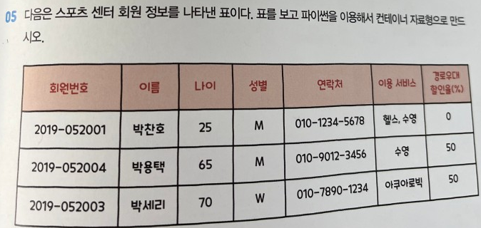 ,'2019-052003':{'name':'박세리', 'age':70, 'gender':'W', 'tel':'010-7890-1234', 'service':['아쿠아로빅'], 'dc':50}