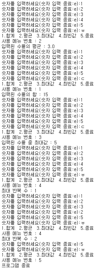 menu = int(input('1.합계 2.평균 3.최대값 4.최빈값 5.종료\n사용 메뉴 번호 : ')) # 함수 선택