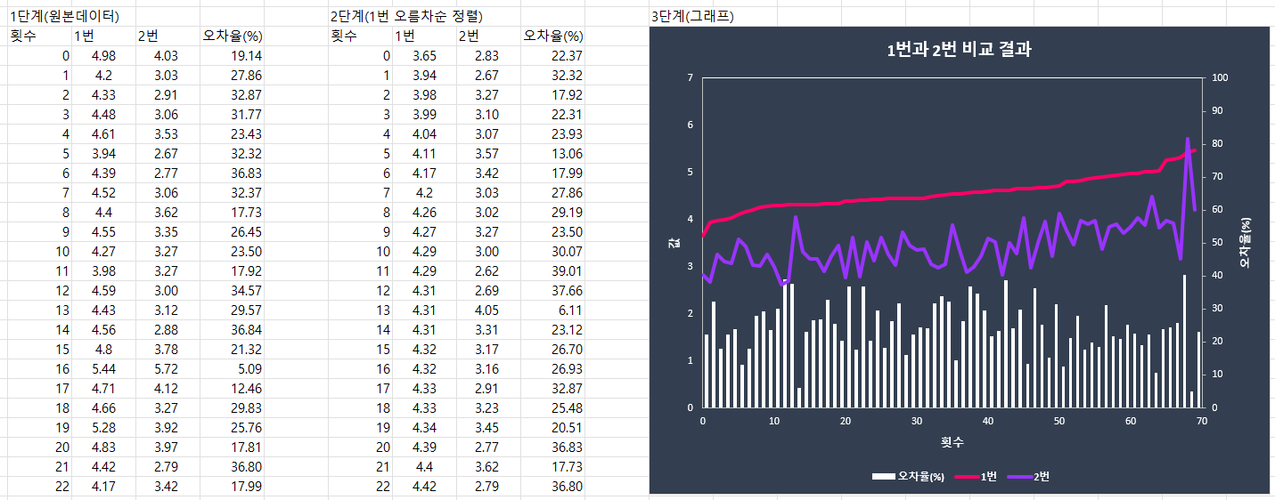 1단계 : 1번값과 2번값의 오차율 구하기