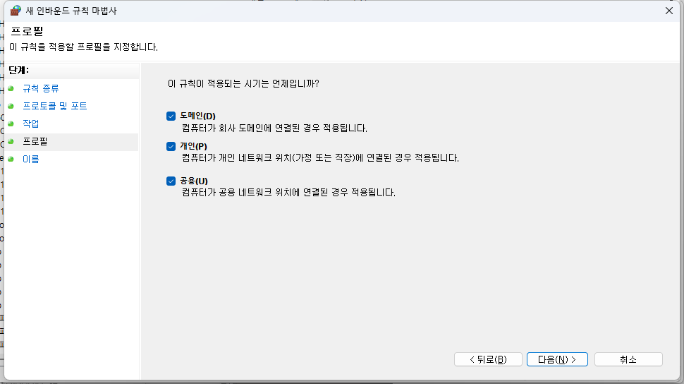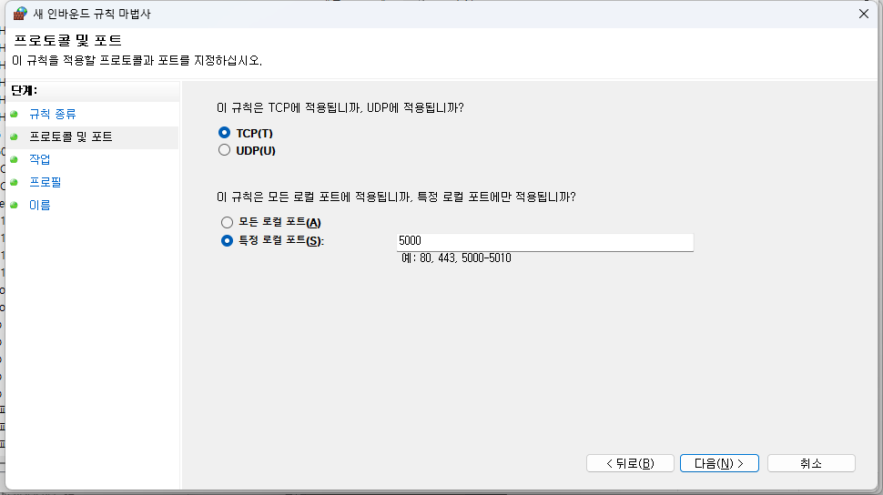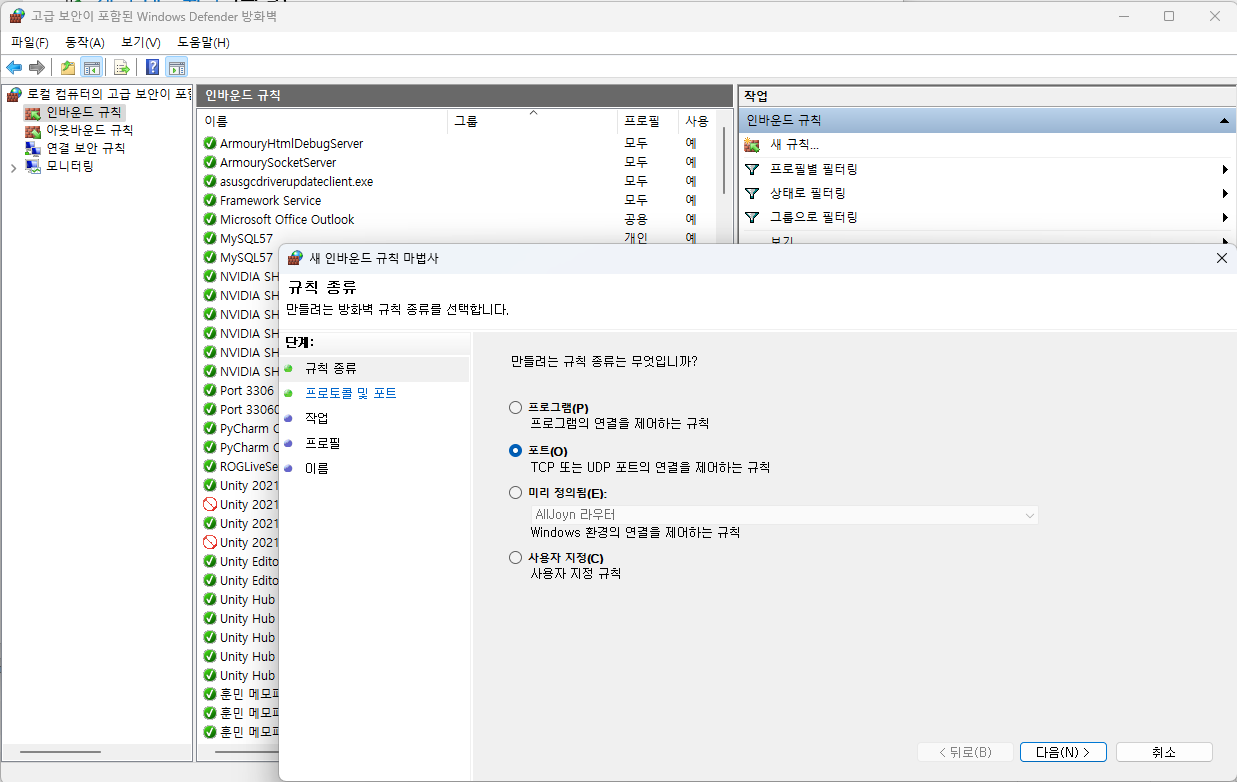 인바운드 규칙 / 새규칙 / 포르토콜 및 포트