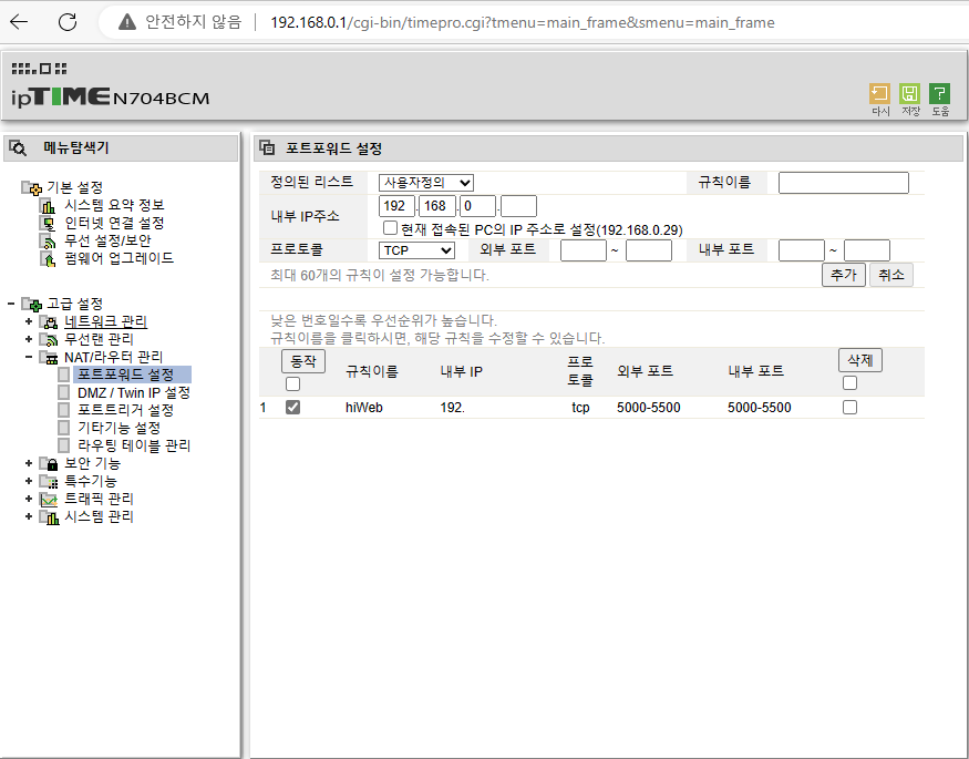 포트포워드 설정 ip 및 포트 지정하고 추가