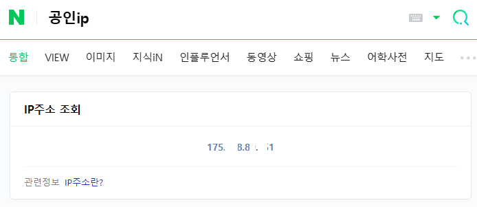 네이버에서 '공인ip'로 검색하면 현재 PC의 외부에서 접속하는 ip 보여 줌