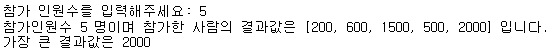 n명의 참여 인원의 점수를 모두 출력하고 그중 가장 높은 값을 출력하세요.