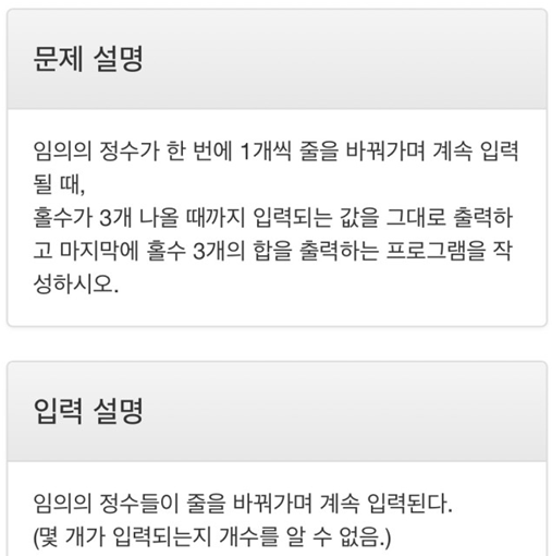 print('홀수 3개의 합 :',n_sum) # 홀수의 합 출력