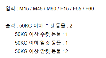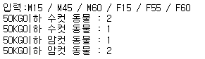 print(f"50KG이하 {'수컷' if g=='M' else '암컷'} 동물 : {dic[g][w]}") # 출력. if문은 M, F에 따라 수컷,암컷 출력
