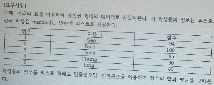 marks = [(1, 'Seo',94) # 학생정보는 튜플로 만듬