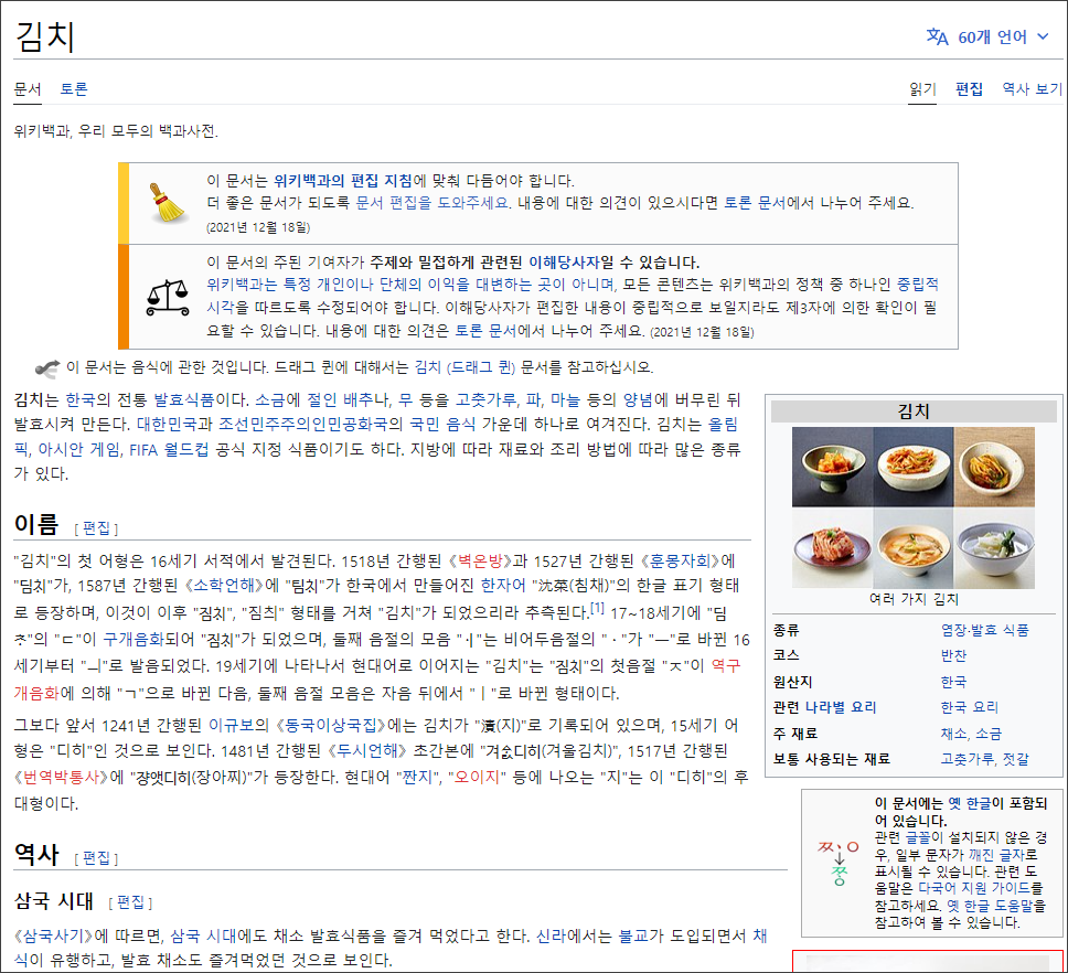 위키백과 사이트에서 김치를 검색해 보면