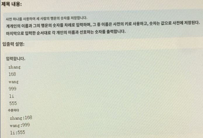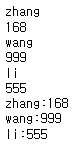dic[last_name] = int(tmp) # 딕셔너리에 이름을 key로 해서 수(int로 문자열을 정수로 변환) 저장