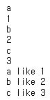 print(f"{key} like {value}")