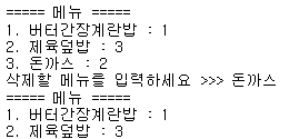 del_menu = input("삭제할 메뉴를 입력하세요 >>> ") # 입력 받기
