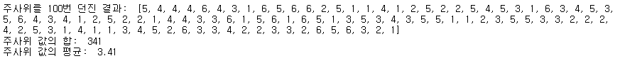 print("주사위를 100번 던진 결과: ", lst) # 리스트 출력
