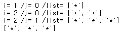다음과 같이 진행상태를 보기 위해서 출력(print)를 추가해 보면 i,j 값에 따라 어떻게 for문이 실행되어 리스트에 *이 추가되는지 확인 할 수 있습니다.