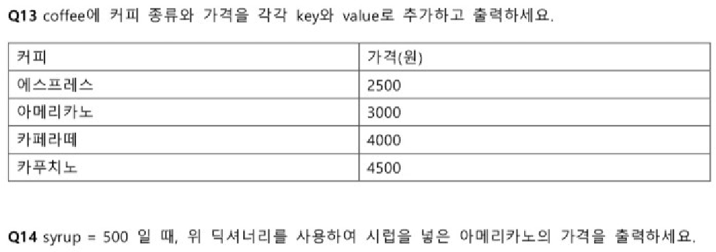 dic = {'에스프레스':2500, '아메리카노':3000, '카페라떼':4000, '카푸치노':4500}